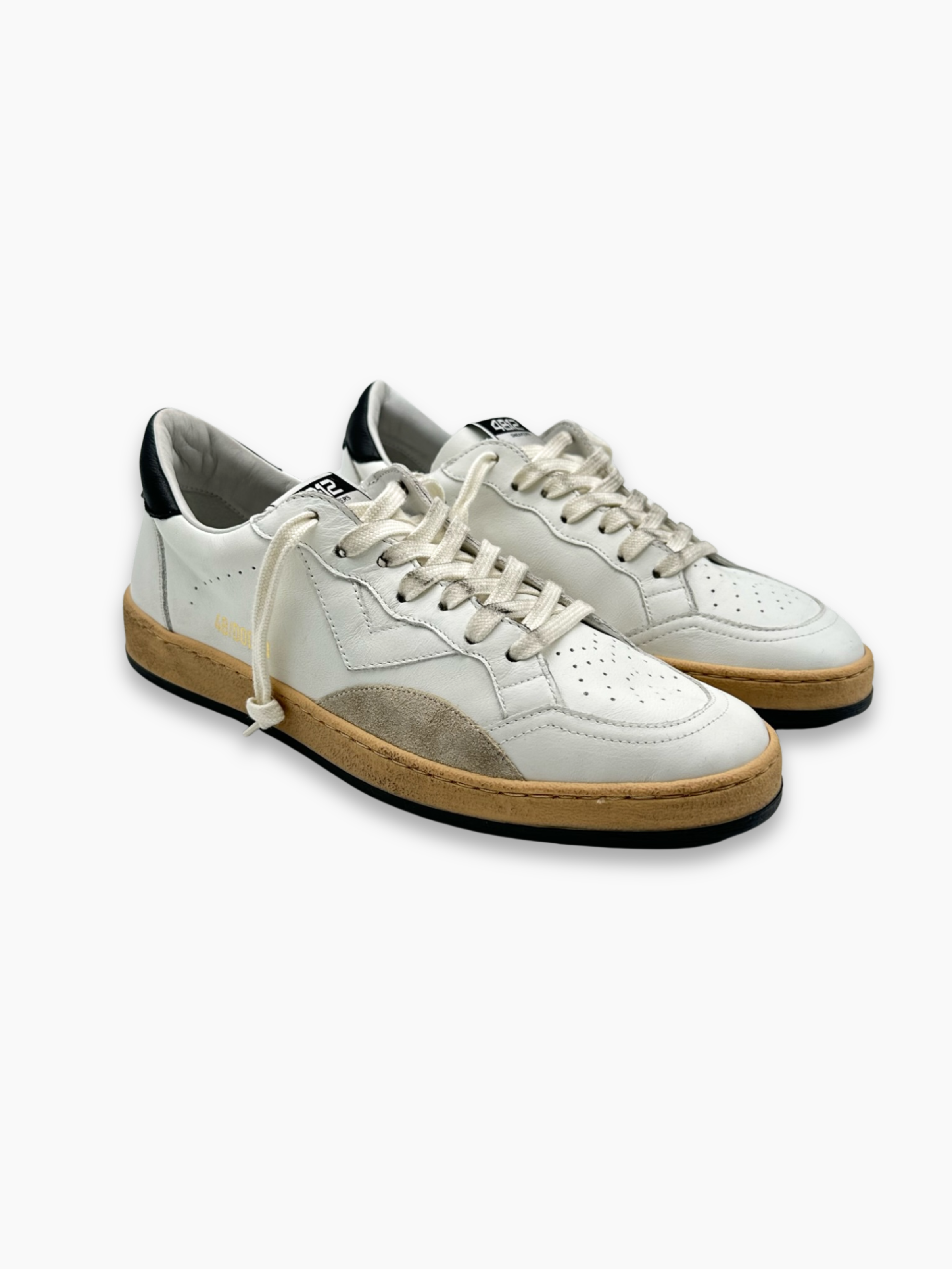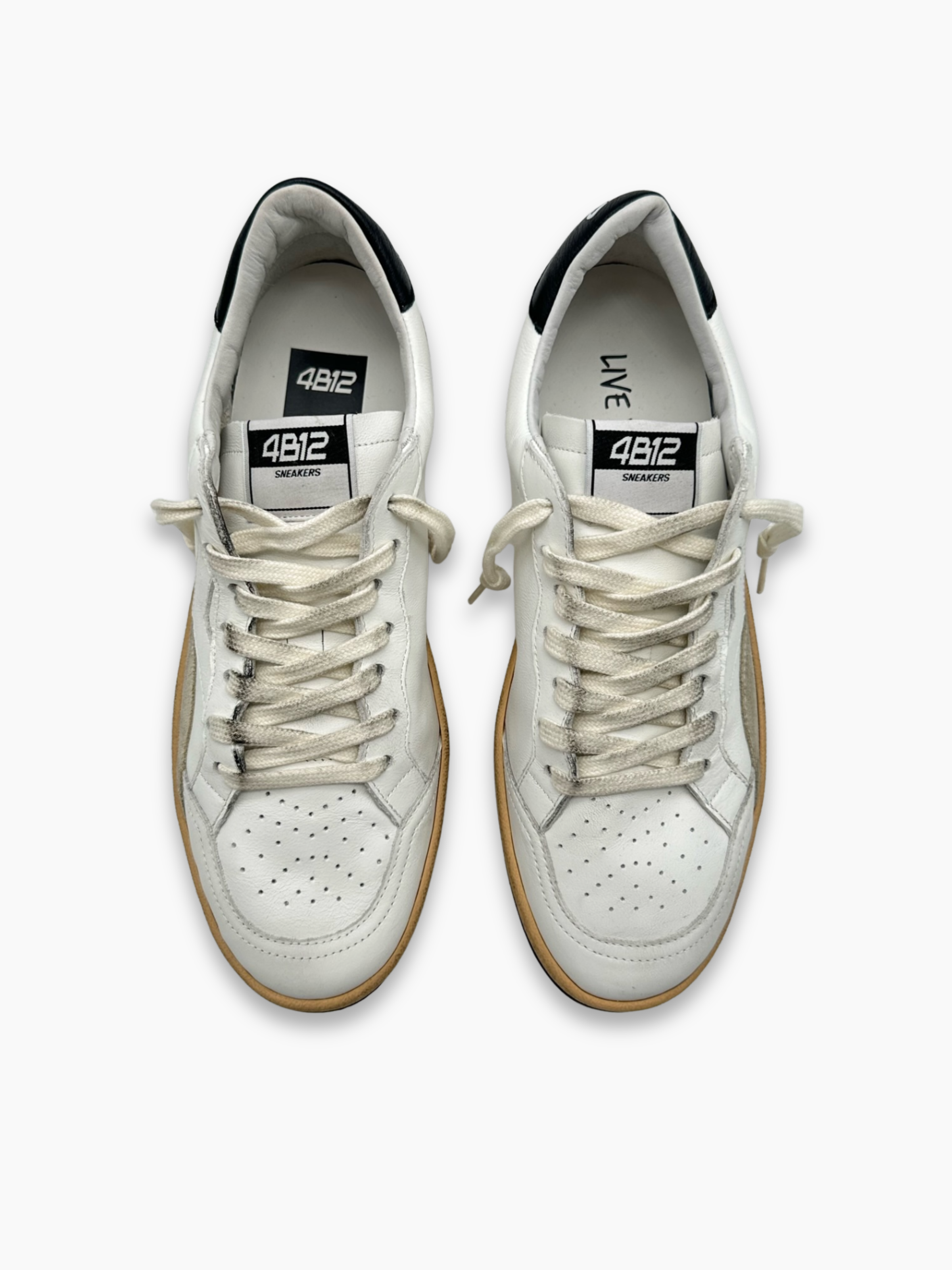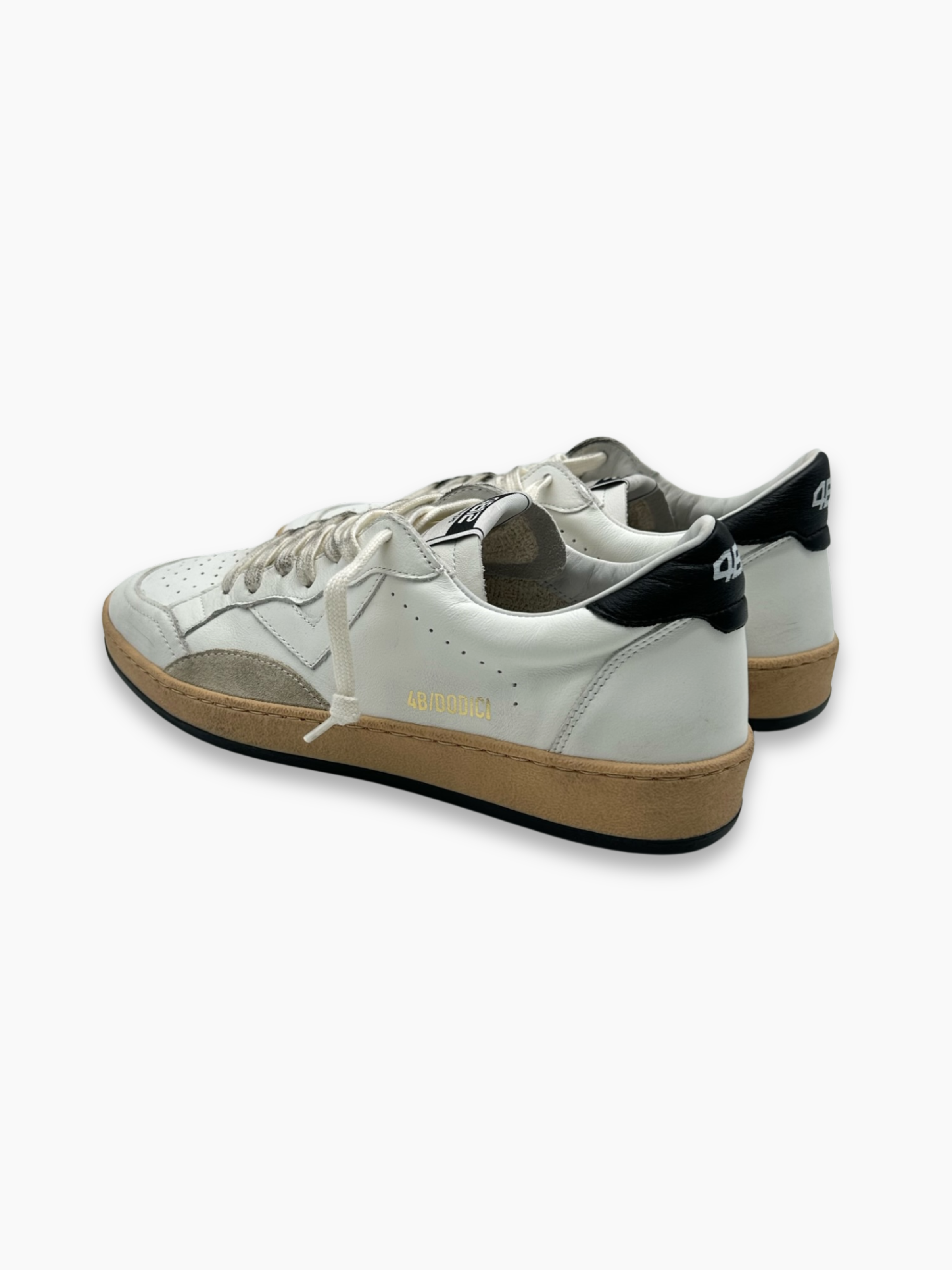 Sneakers 4B12 in pelle bianca con dettagli neri, caratterizzate da un’estetica minimal e linee essenziali che uniscono comfort e stile Made in Italy. La suola beige effetto vintage aggiunge un tocco rétro, mentre il contrasto tra bianco e nero crea un look intramontabile e versatile.
