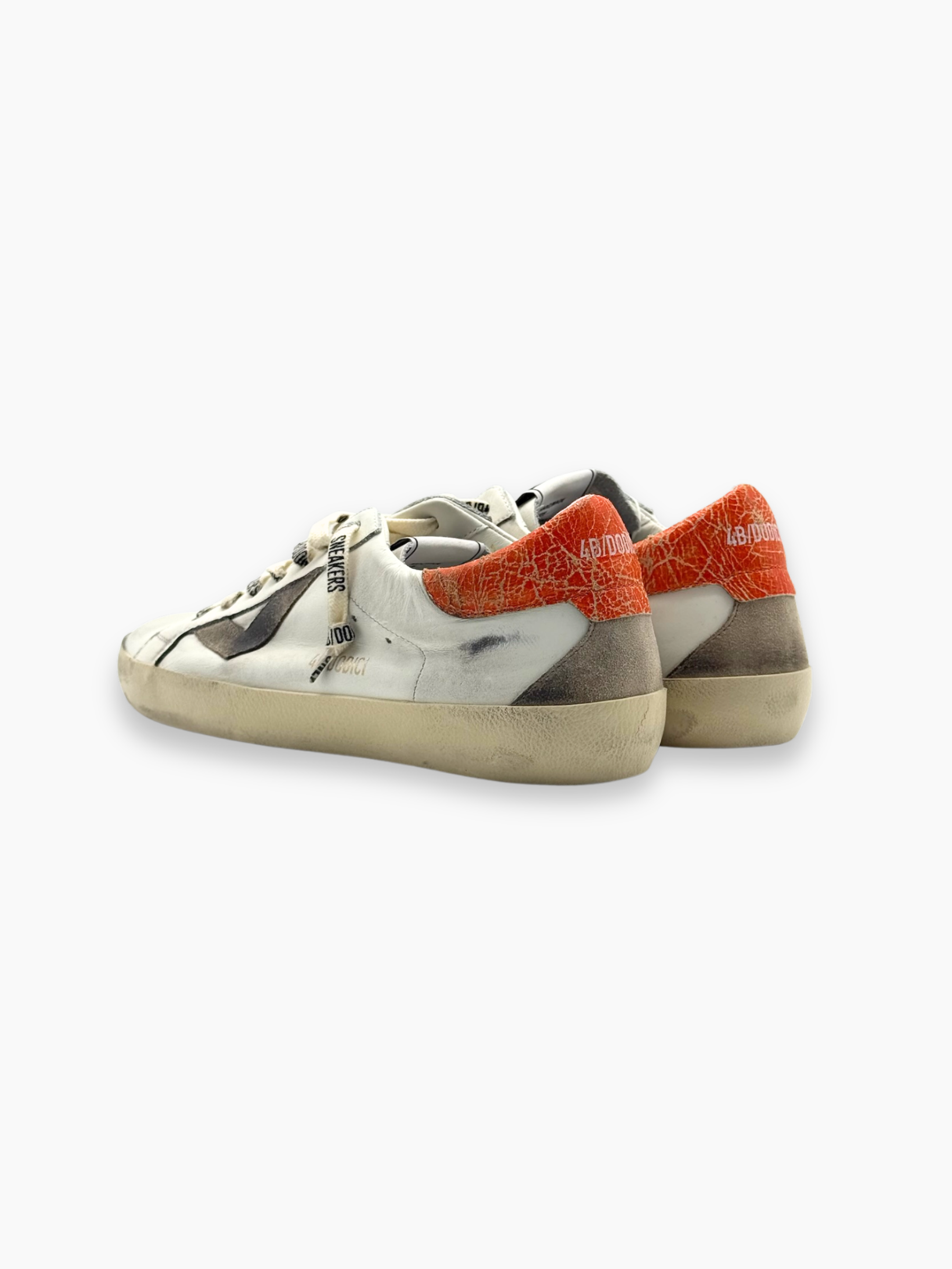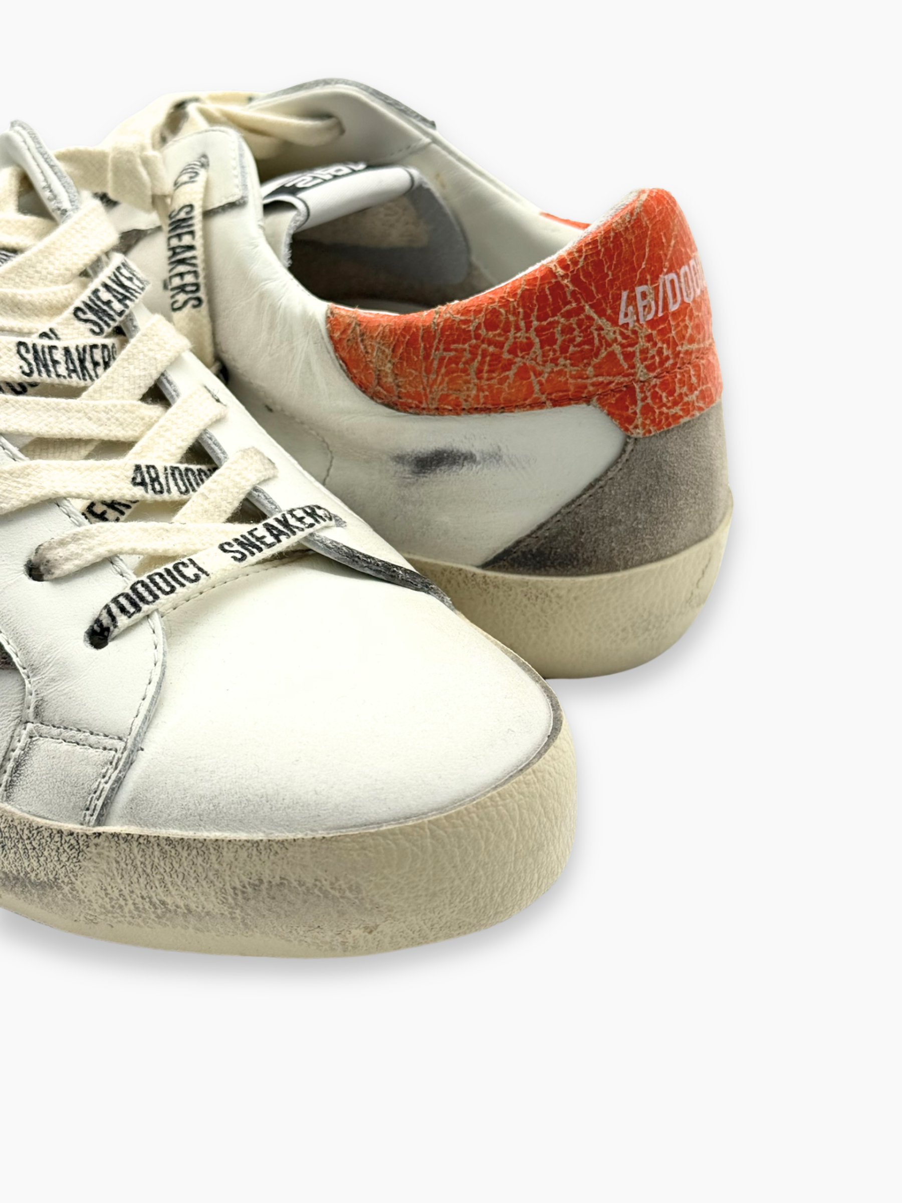 Sneakers 4B12 dal design vintage e deciso, caratterizzate da una tomaia in pelle offwhite con dettagli effetto used e tallone arancione brillante. Perfette per aggiungere un tocco di carattere ai look casual, unendo stile urbano e qualità artigianale Made in Italy.