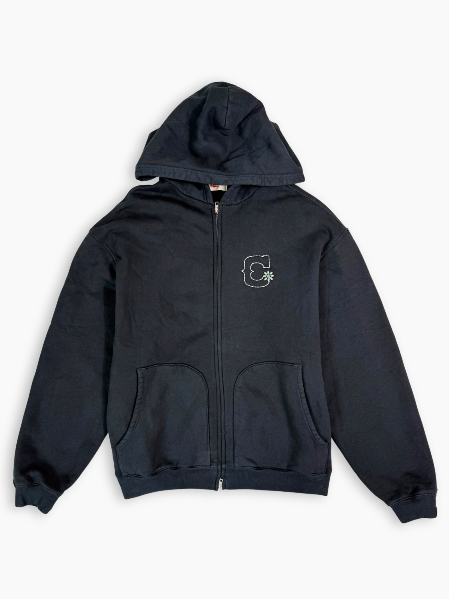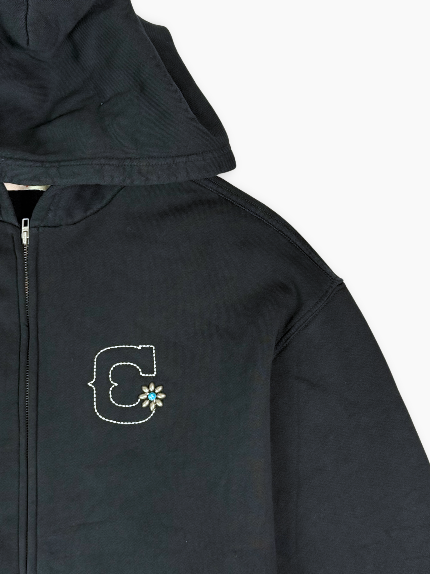 Felpa nera con cappuccio e chiusura a zip, caratterizzata da un ricamo frontale con lettera “C” stilizzata e piccolo fiore, dettaglio che aggiunge un tocco grafico e distintivo. Dotata di tasche frontali e polsini elasticizzati, offre un look casual e versatile, ideale per completare outfit streetwear e quotidiani con comfort e personalità.