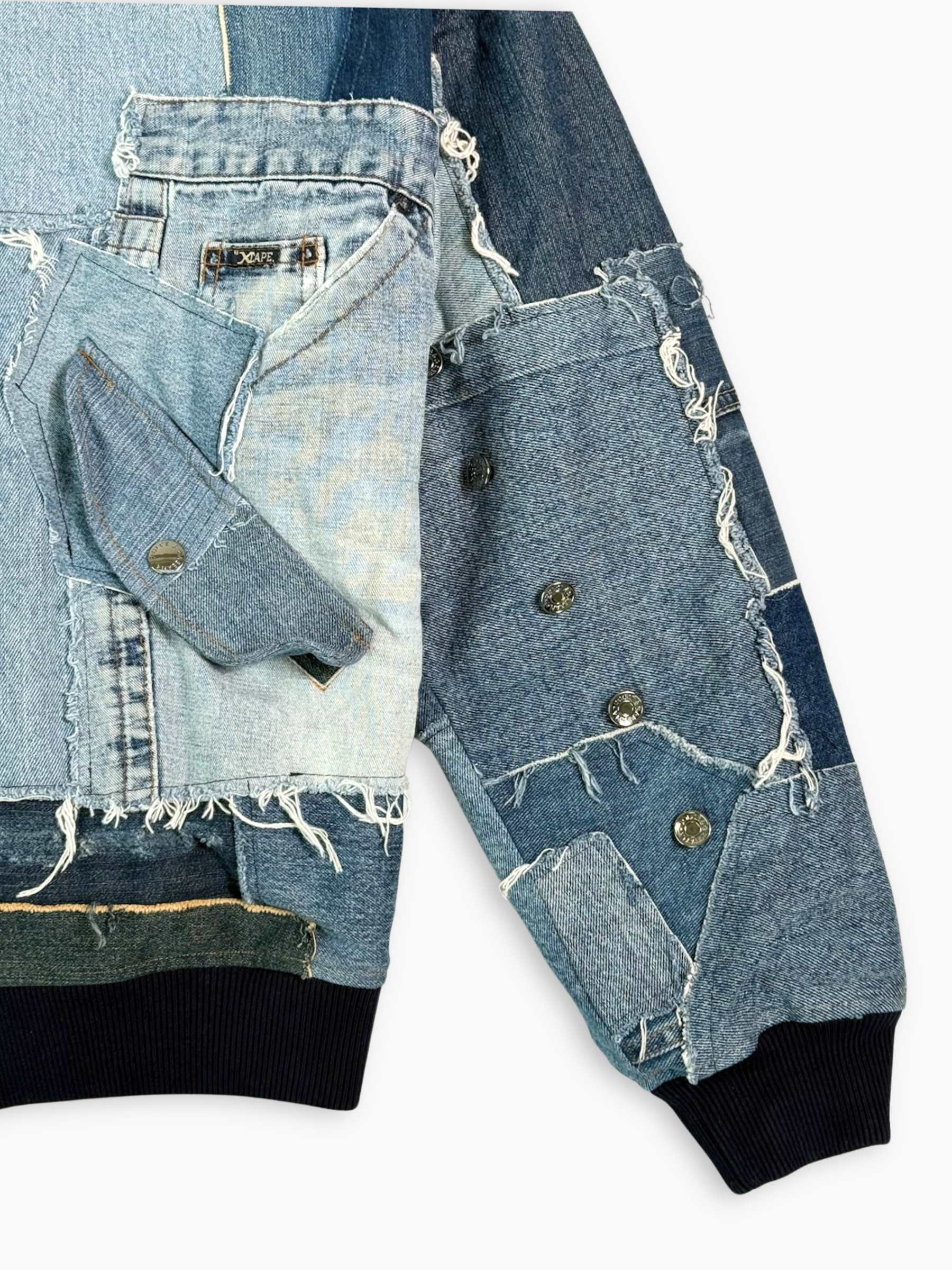 Giubbotto in denim dallo stile patchwork, realizzato con inserti e pannelli sovrapposti che creano un effetto unico e ricercato. Il design multi-texture mette in risalto diverse tonalità di blu, dettagli vissuti e finiture sfrangiate, per un look decisamente bold e contemporaneo. Dotato di zip frontale e tasche applicate, è un capo statement perfetto per chi cerca un outerwear distintivo e dal carattere deciso