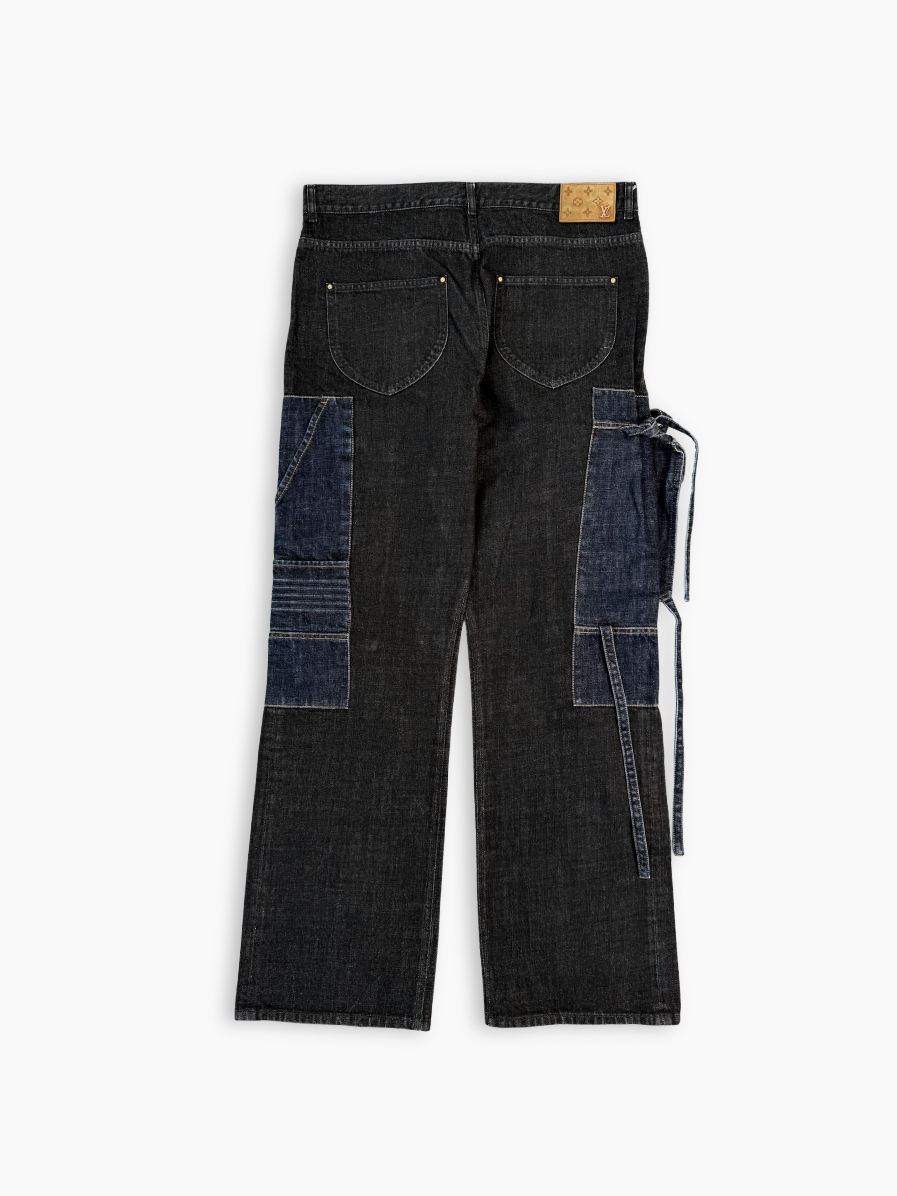 Jeans cargo neri in denim con ampie tasche laterali in tessuto patchwork blu a contrasto. Le tasche applicate presentano cuciture marcate e dettagli funzionali, tra cui lacci e scomparti multipli, che richiamano l’estetica utility contemporanea. Il design straight fit unisce praticità e stile, rendendo questo capo perfetto per outfit streetwear dal carattere deciso. Realizzati in cotone robusto, offrono comfort e resistenza per l’uso quotidiano.