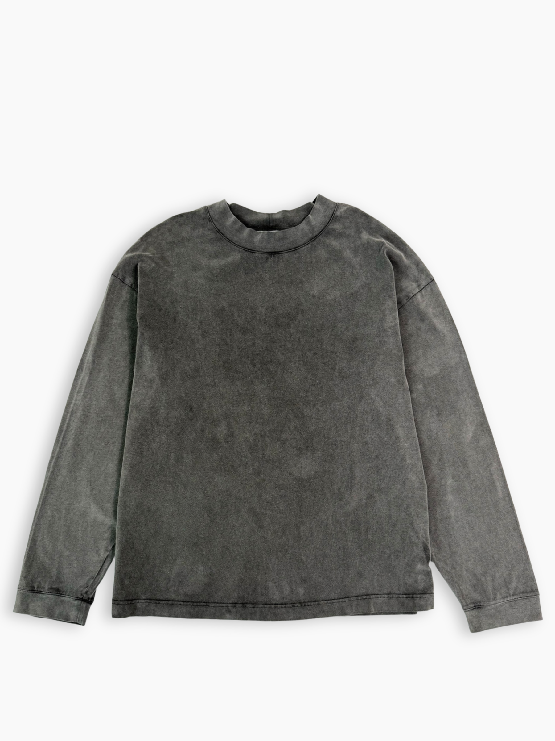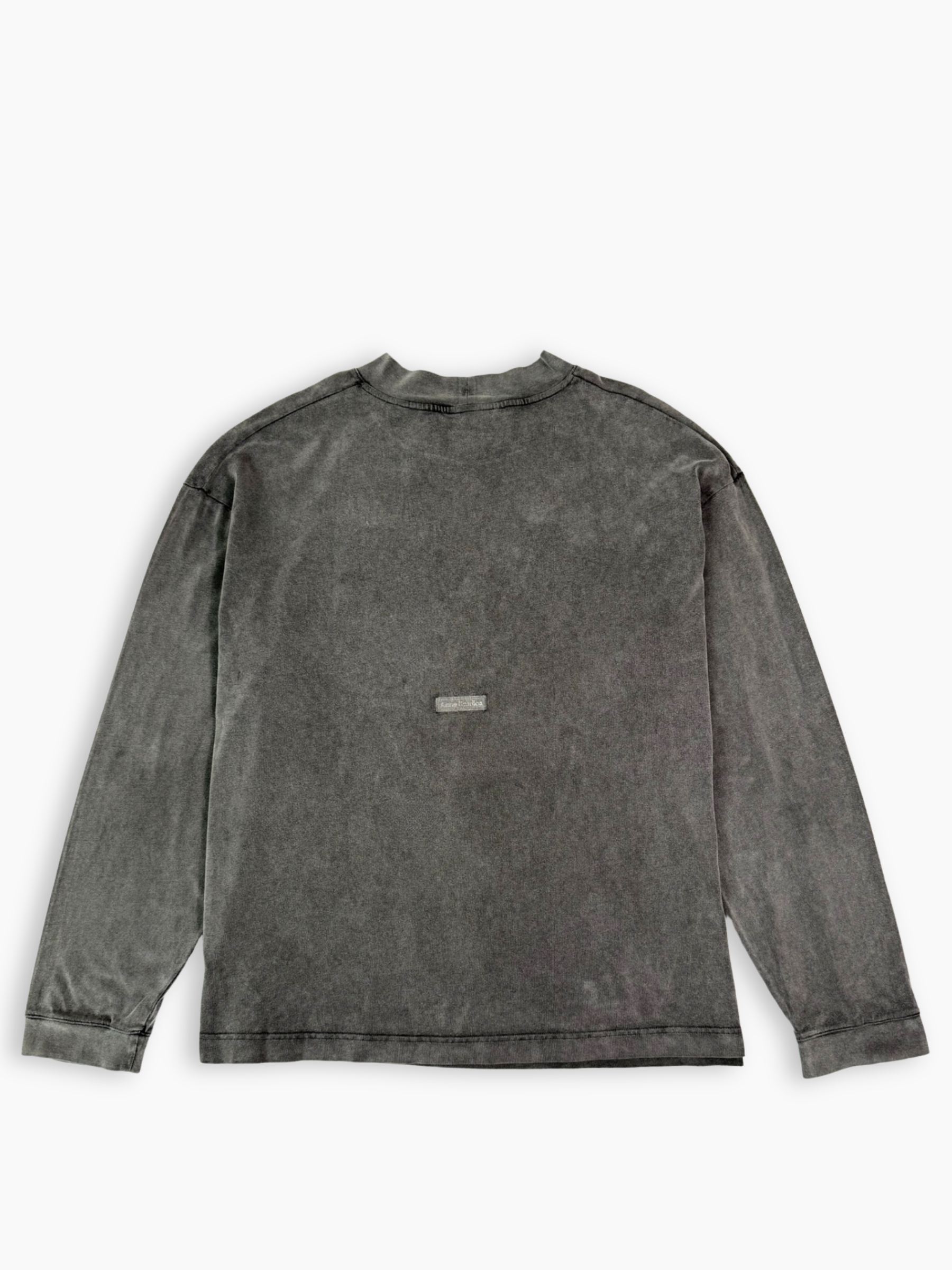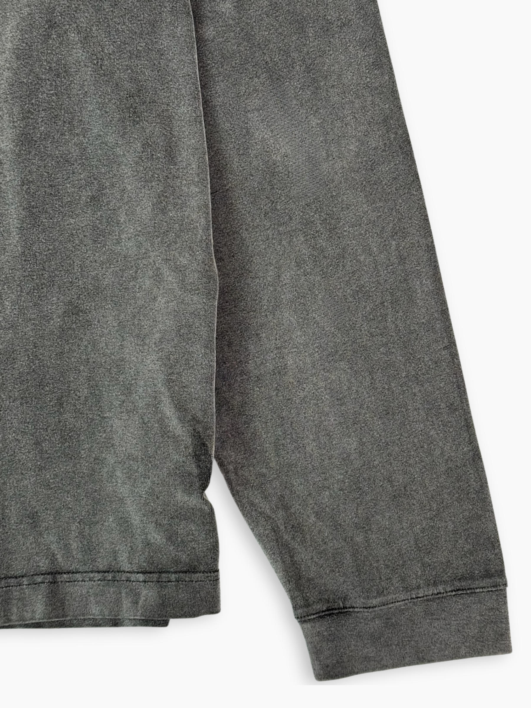 Maglia grigia a maniche lunghe con effetto washed, caratterizzata da un look minimal e contemporaneo. Il design presenta collo tondo, cuciture tonali e una vestibilità morbida pensata per offrire comfort quotidiano senza rinunciare allo stile. Il trattamento del tessuto dona un aspetto vissuto e moderno, perfetto per abbinamenti casual e streetwear.
