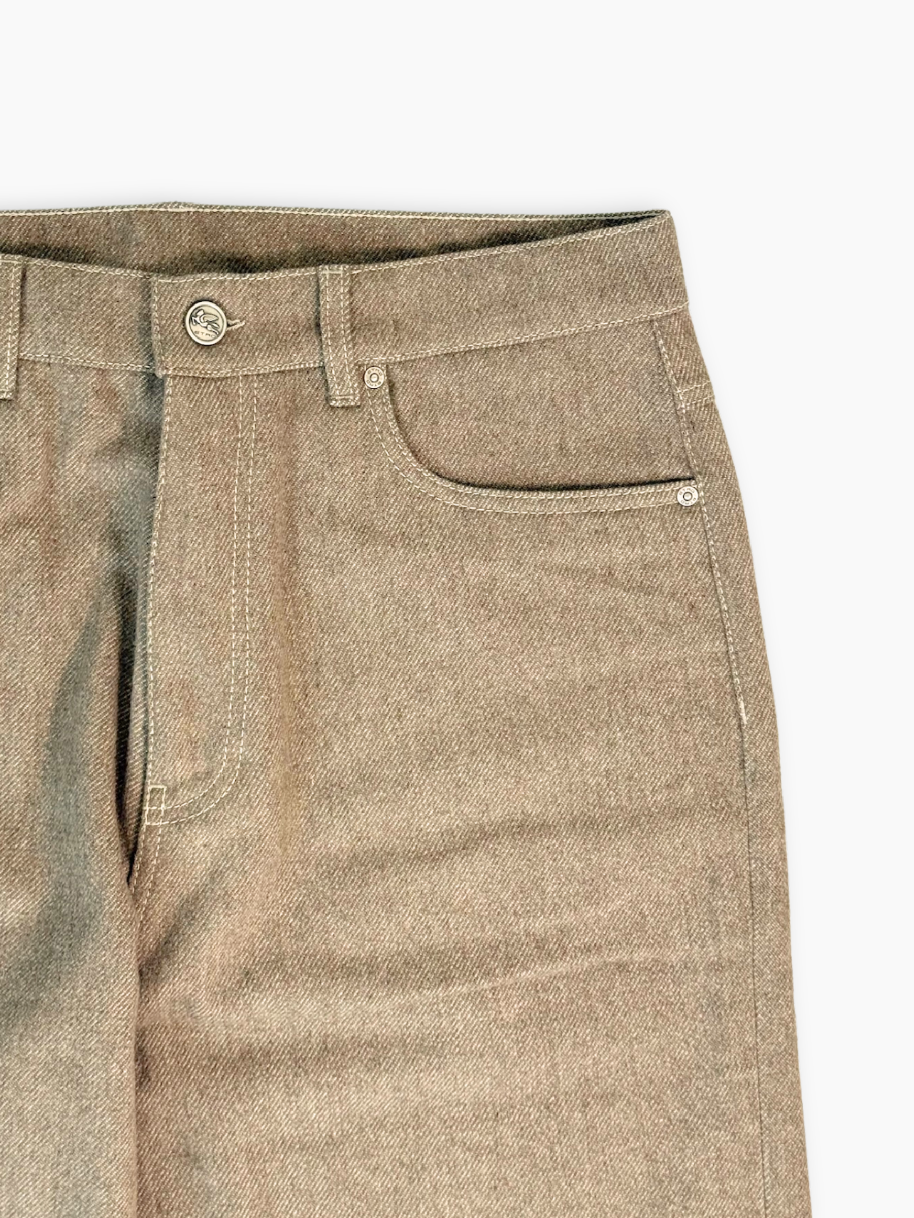Pantaloni beige a gamba larga realizzati in tessuto morbido e confortevole, ideali per un look casual-elevato. Il design pulito e minimal presenta una costruzione classica a 5 tasche con chiusura a bottone e zip. La vestibilità ampia e fluida conferisce un’estetica moderna e rilassata, perfetta per outfit quotidiani o abbinamenti più ricercati.