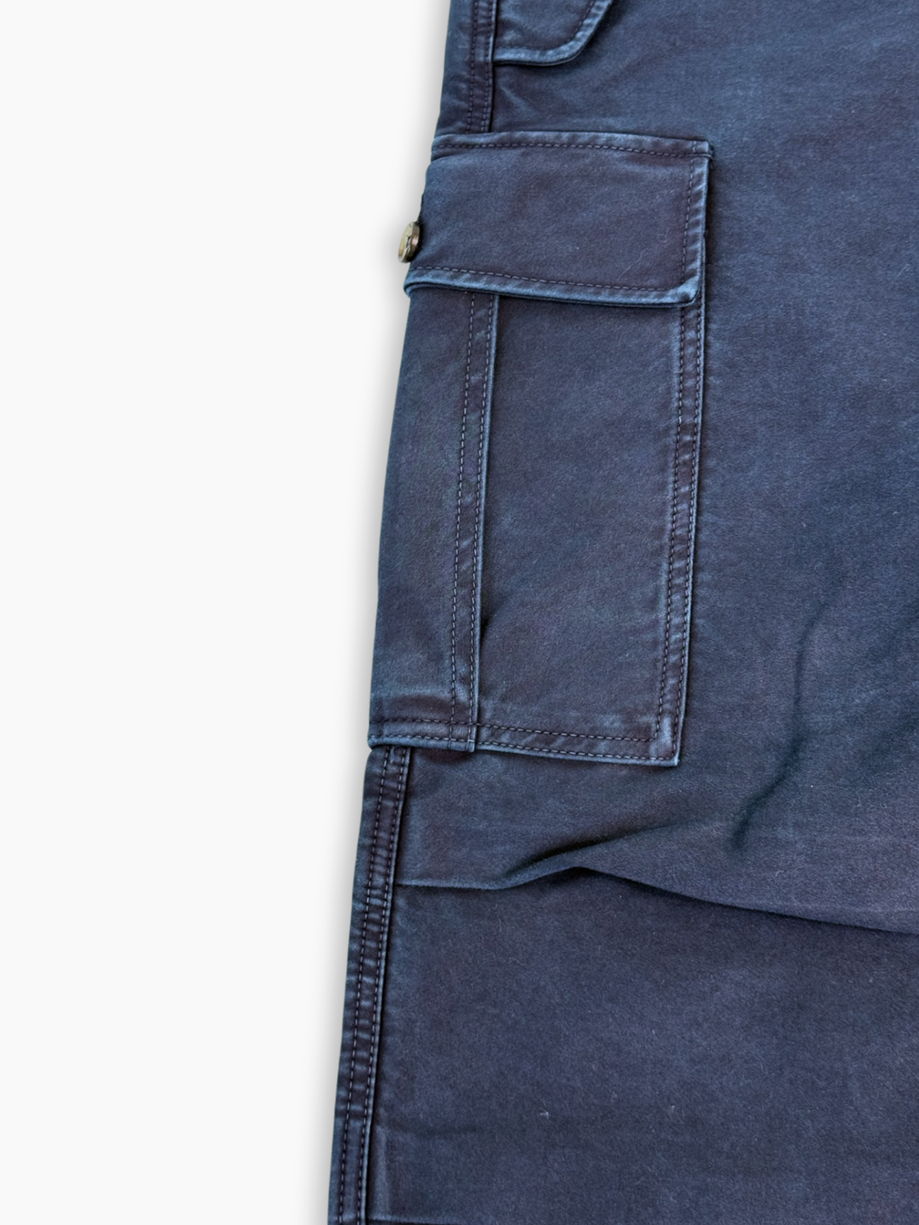 Pantaloni cargo blu realizzati in cotone resistente, caratterizzati da una linea morbida e da un’estetica versatile e funzionale. Il modello presenta tasche laterali applicate con pattina, vita elasticizzata sul retro per un comfort maggiore e chiusura frontale con bottone e zip. Perfetti per un look casual, street o utility, sono un capo pratico e contemporaneo, ideale per l’uso quotidiano.
