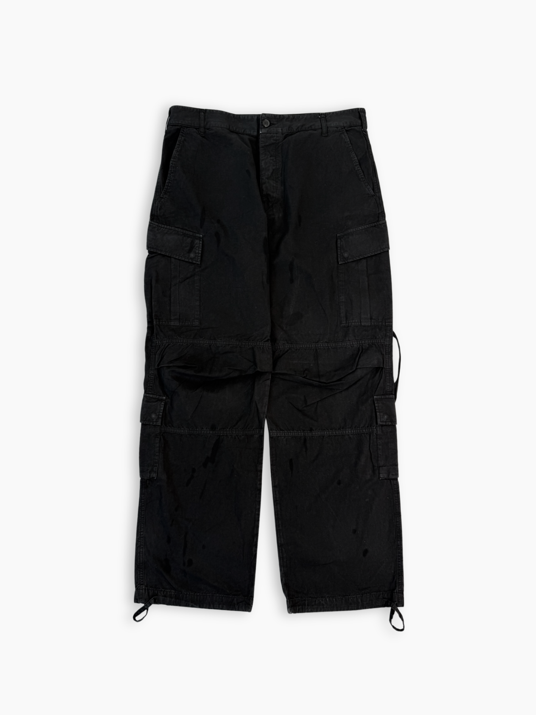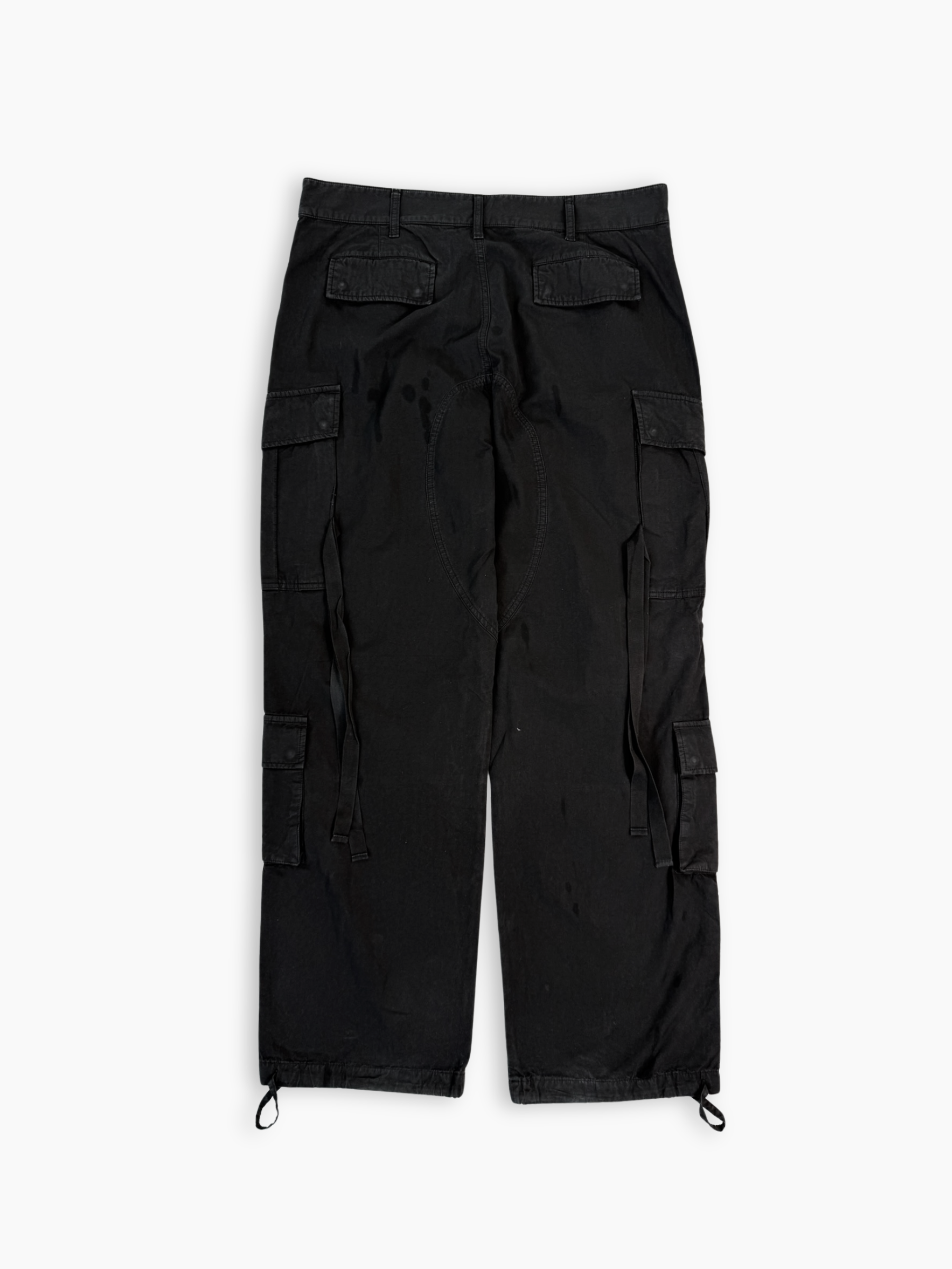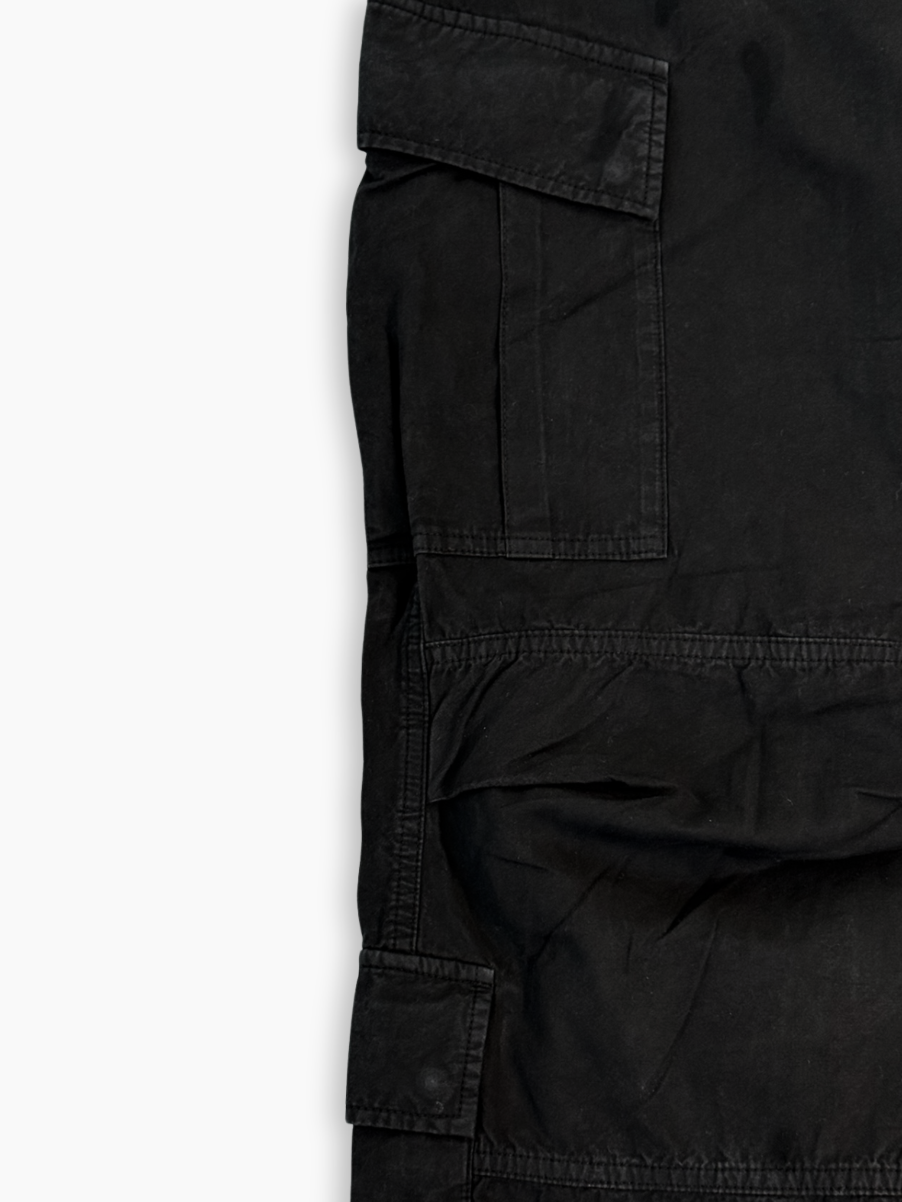 Pantaloni cargo neri dal design utility, realizzati in cotone resistente con finitura leggermente used. Caratterizzati da ampi tasconi laterali, cuciture funzionali e lacci regolabili sul fondo gamba, questi cargo uniscono praticità e stile urbano. La vestibilità dritta e la struttura tecnica li rendono perfetti per look streetwear dal carattere deciso e contemporaneo.