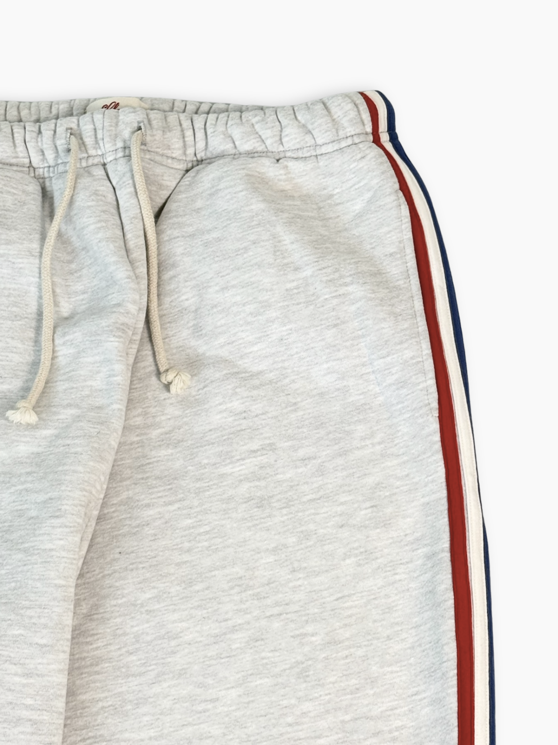 Pantaloni grigi in felpa leggera con bande laterali tricolore in rosso, bianco e blu. Il design sportivo e rilassato è arricchito da una vestibilità dritta e fondo leggermente svasato, ideale per un look casual e contemporaneo. La vita elasticizzata con coulisse garantisce comfort quotidiano, mentre le bande laterali aggiungono un tocco dinamico e distintivo