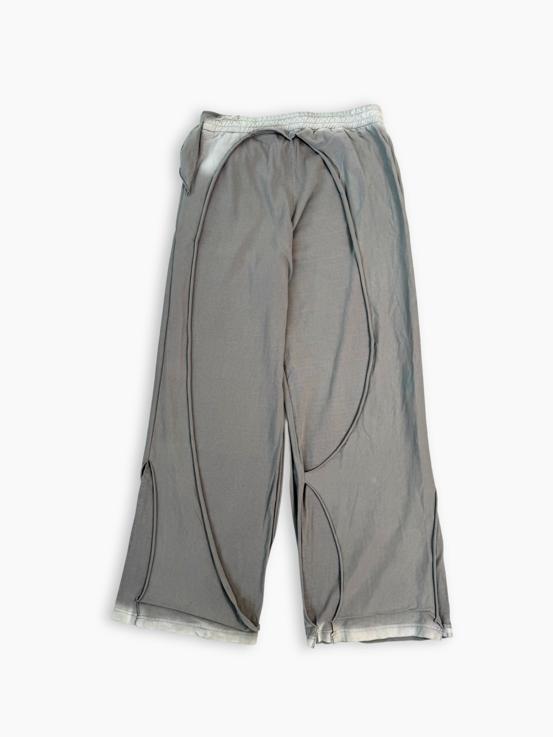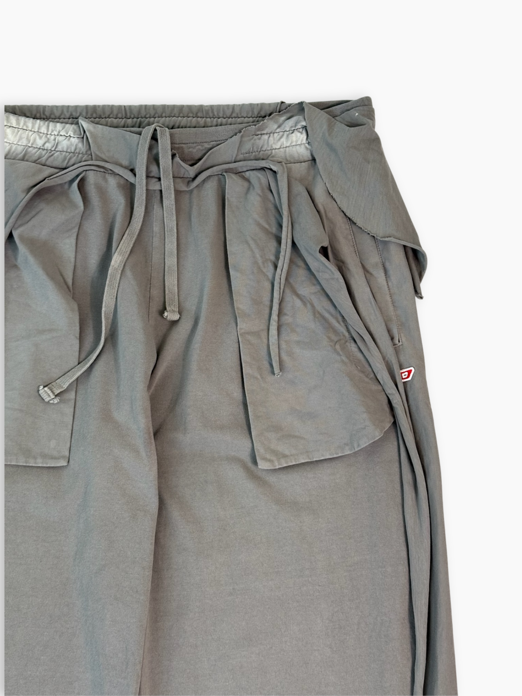 Pantaloni grigi tecnici dal design innovativo con pannelli sagomati e costruzione multilayer. Il modello presenta una vestibilità morbida e fluida, impreziosita da tasconi frontali con pattina e coulisse regolabile in vita. Le cuciture curve e il fondo leggermente aperto conferiscono un’estetica contemporanea e sperimentale, ideale per look street, techwear e fashion-forward.