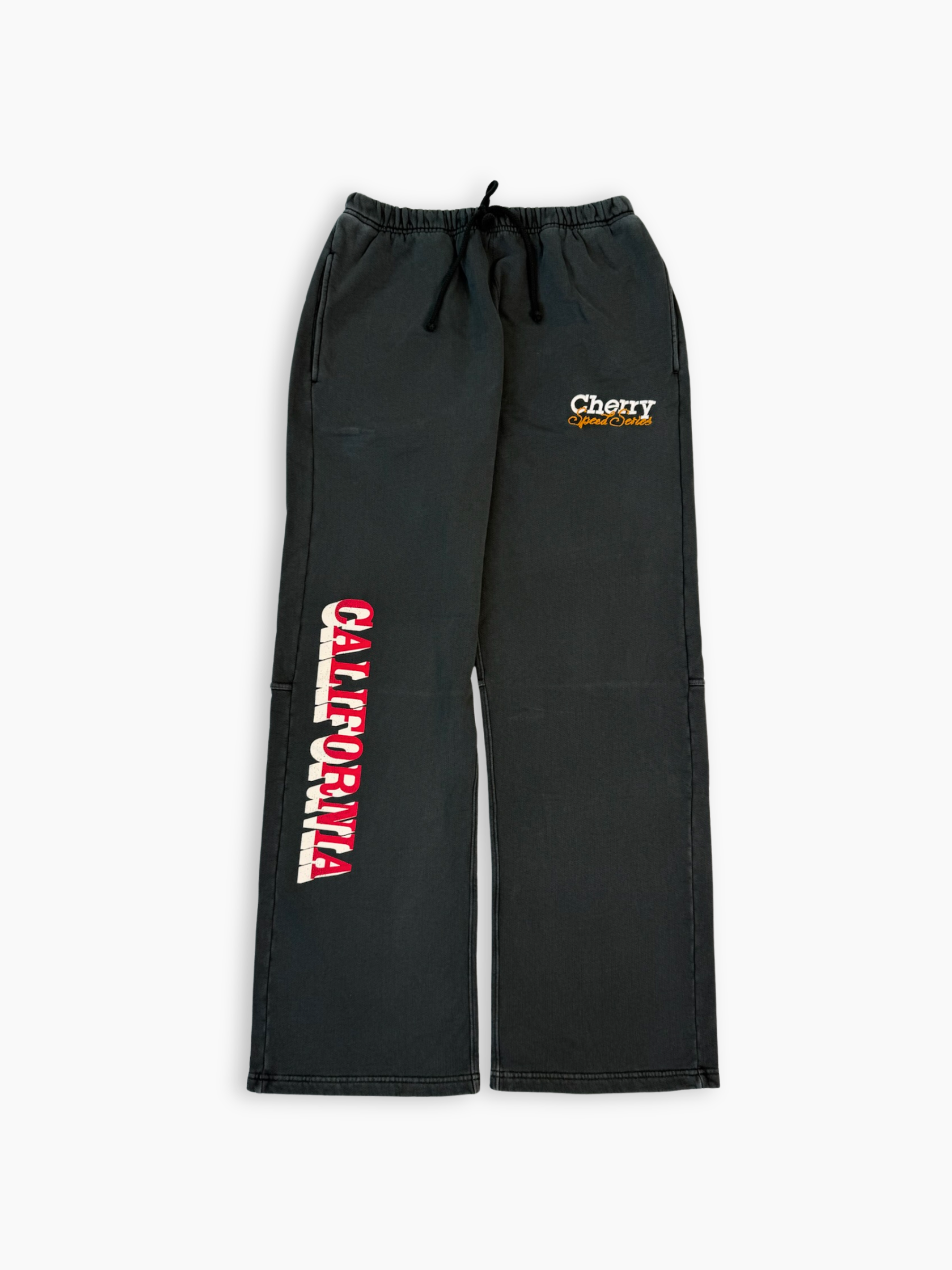 Pantaloni neri dallo stile relaxed, caratterizzati da stampa verticale California sulla gamba sinistra e logo Cherry Speed Series ricamato sul fronte. Un capo streetwear dal carattere deciso, ideale per look casual e contemporanei. La vita elasticizzata con coulisse garantisce comfort e regolazione ottimale.