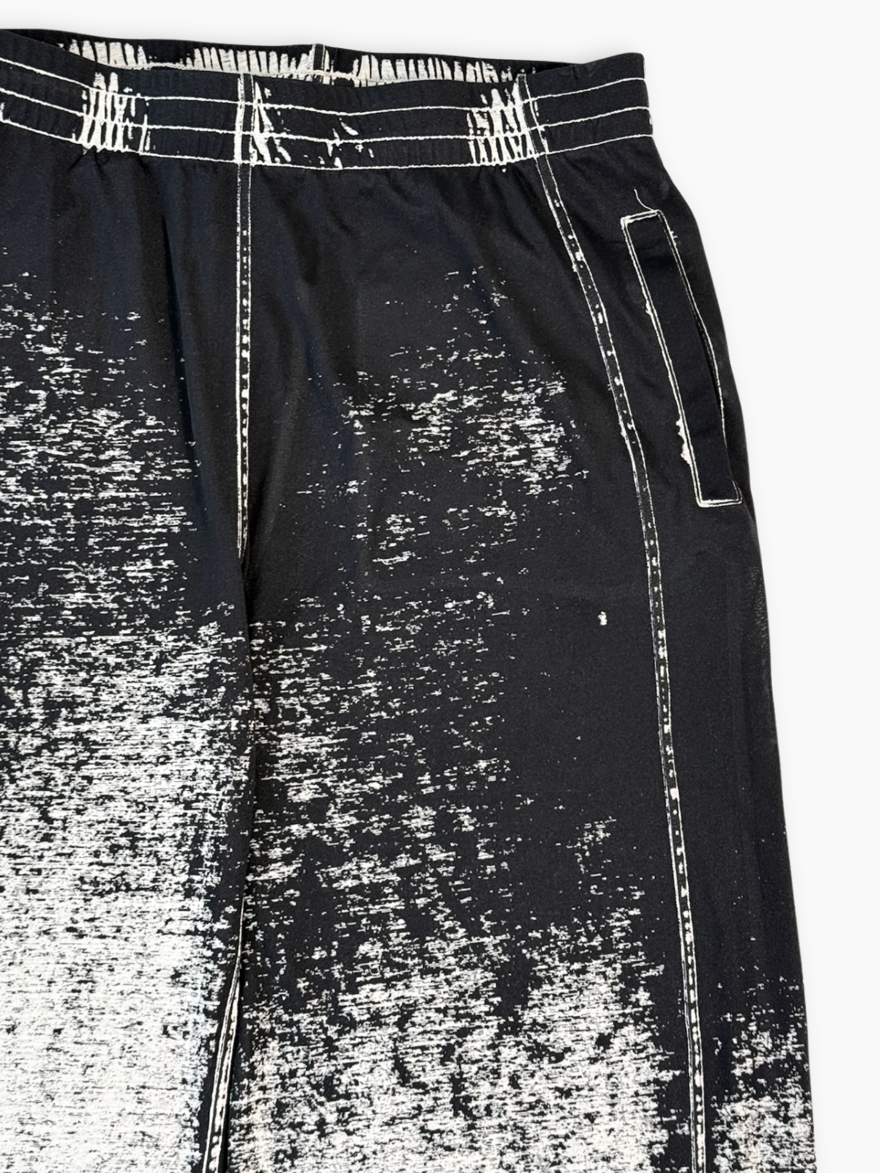 Pantaloni neri con trattamento effetto sbiadito che crea un contrasto artistico e contemporaneo. Il design presenta cuciture a vista bianche che definiscono la struttura del capo e ne enfatizzano il carattere streetwear. La vestibilità ampia e la vita elasticizzata con coulisse garantiscono comfort e libertà di movimento, rendendo questi pantaloni perfetti per look urbani dal forte impatto visivo.