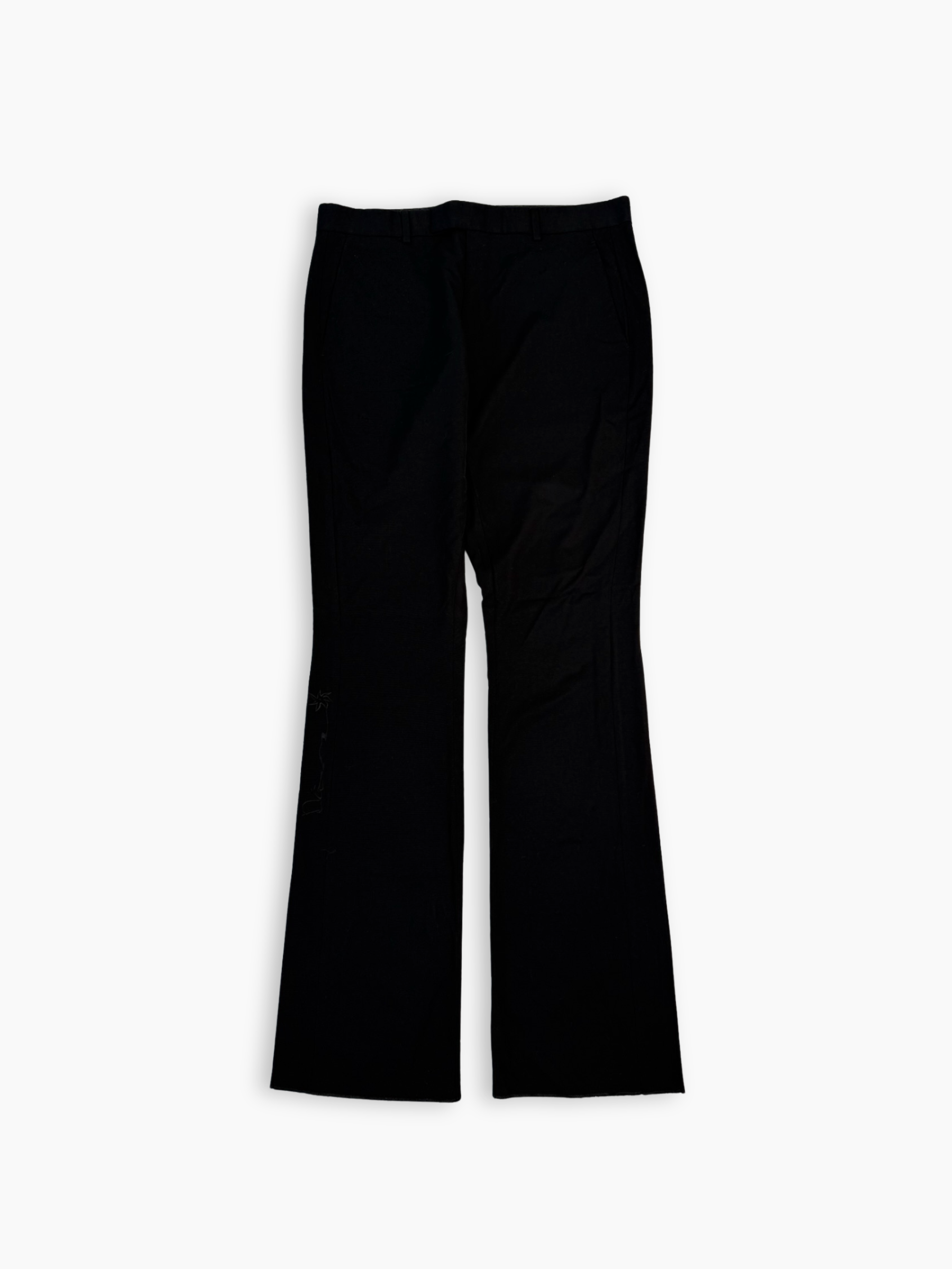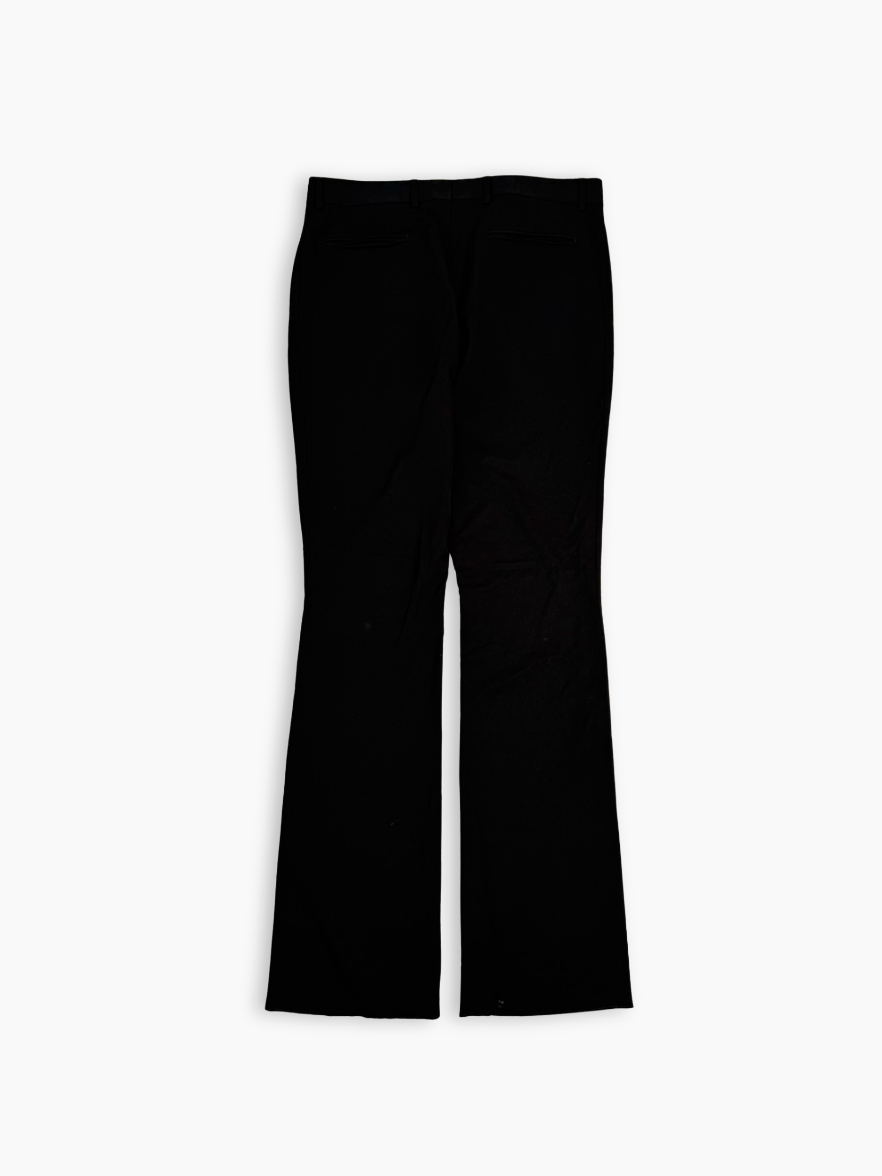 Pantaloni neri eleganti a gamba svasata, caratterizzati da una linea pulita e contemporanea che valorizza la silhouette. Il design minimal e il taglio flare li rende perfetti per look eleganti o streetwear ricercati