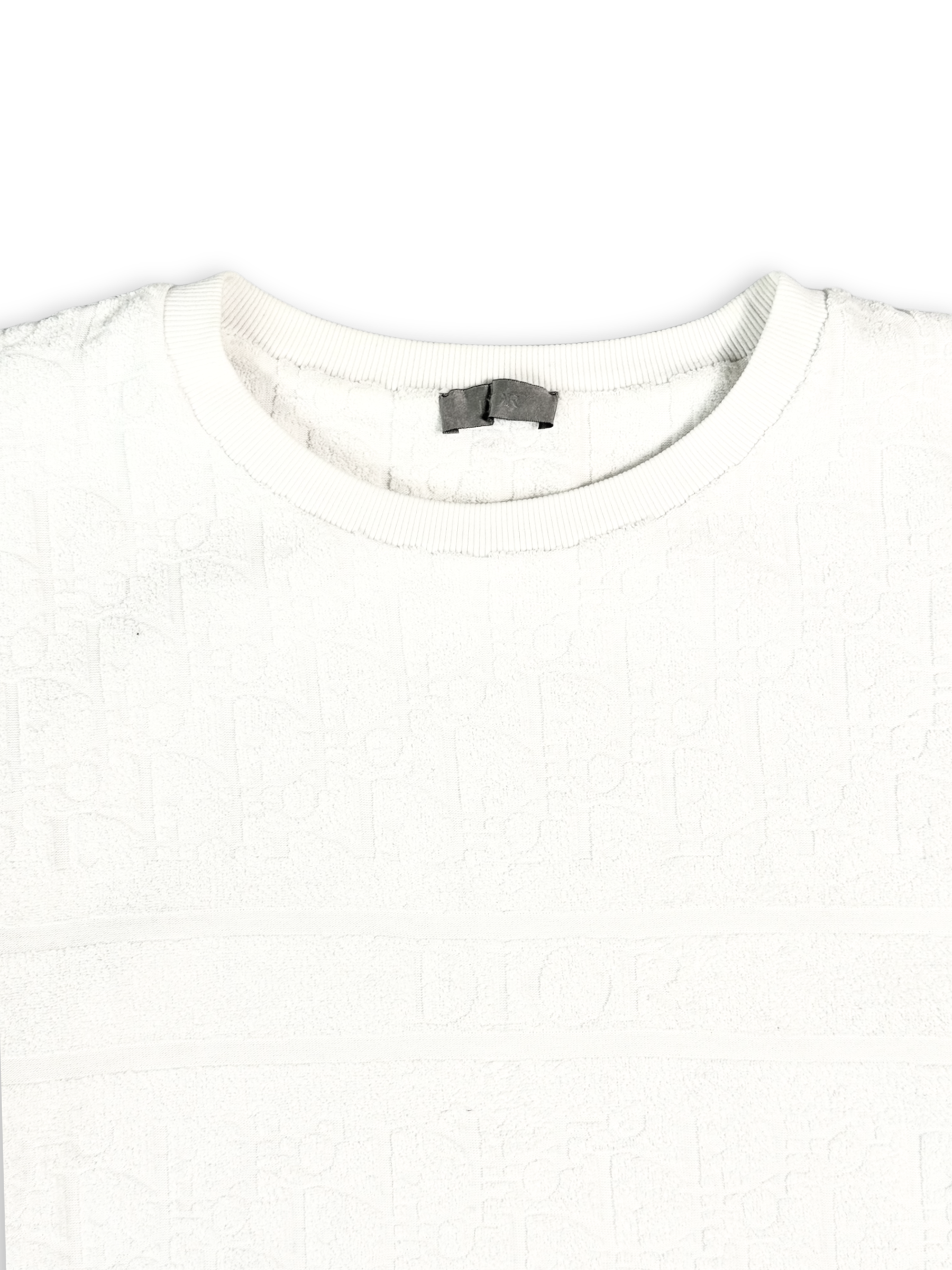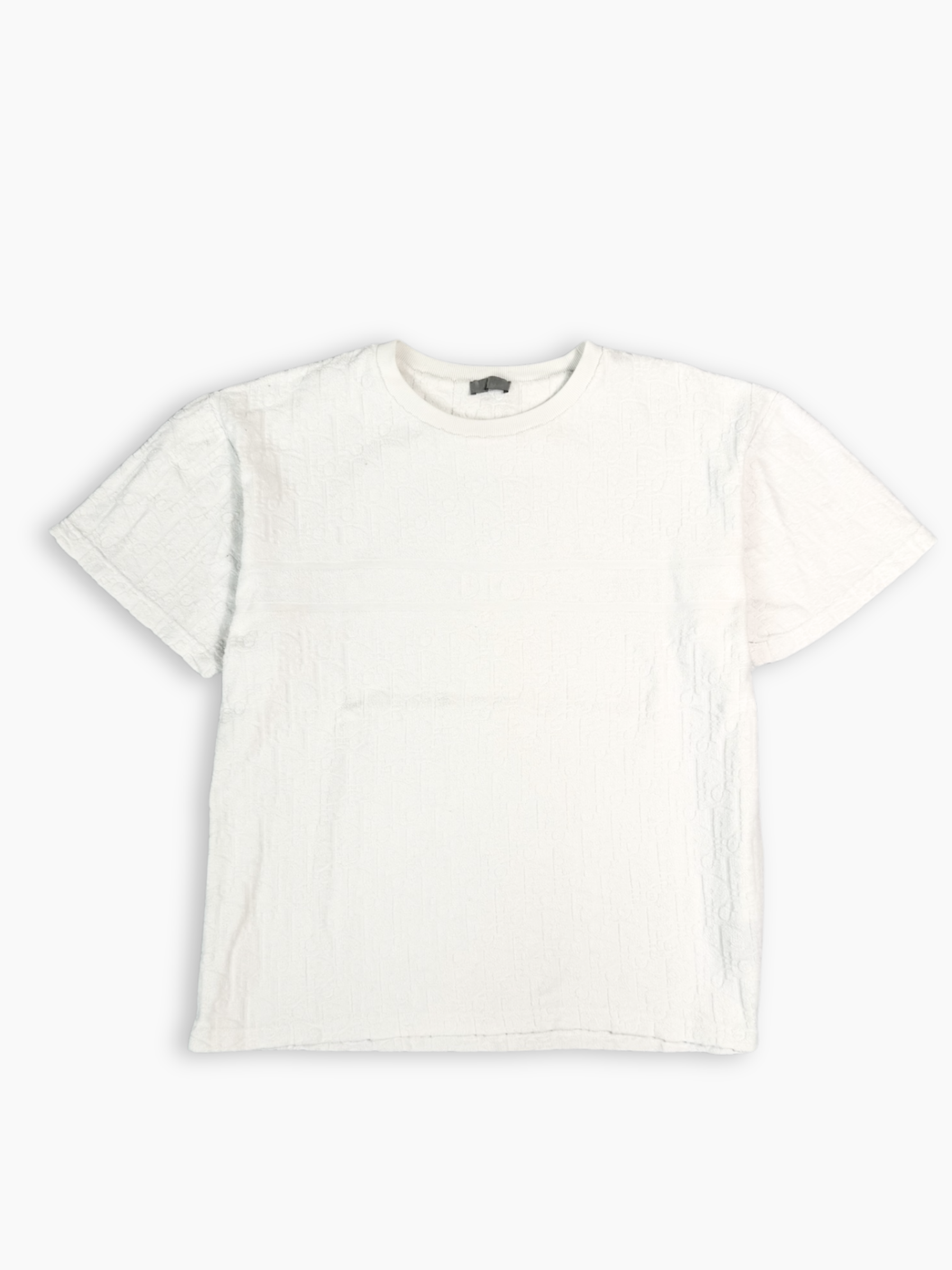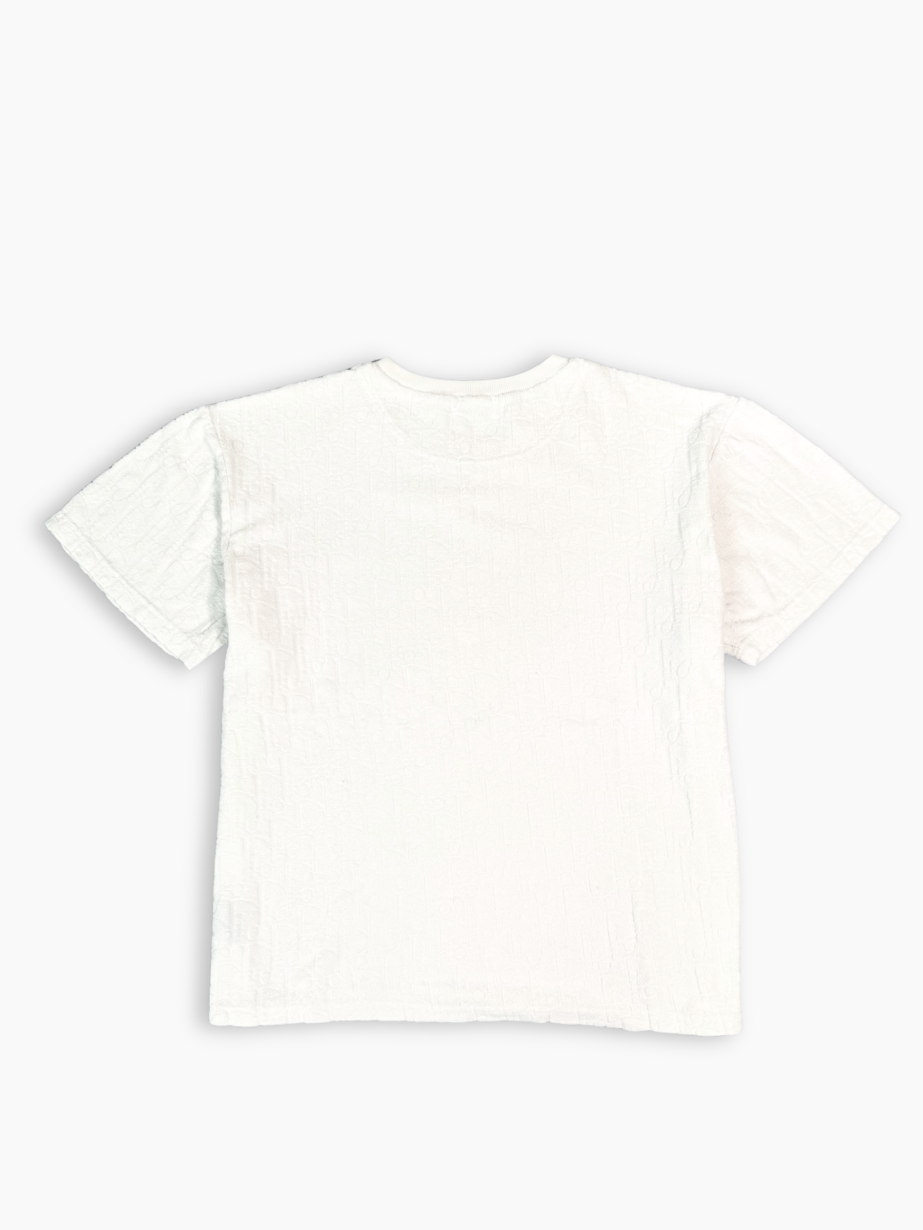 T-shirt bianca a maniche corte caratterizzata da un elegante motivo monogram inciso tono su tono sull’intera superficie. Il design pulito e raffinato si abbina a una costruzione di alta qualità, offrendo un look minimal ma distintivo. Realizzata in morbido cotone, assicura comfort quotidiano e una vestibilità regolare, perfetta per outfit casual e sofisticati.